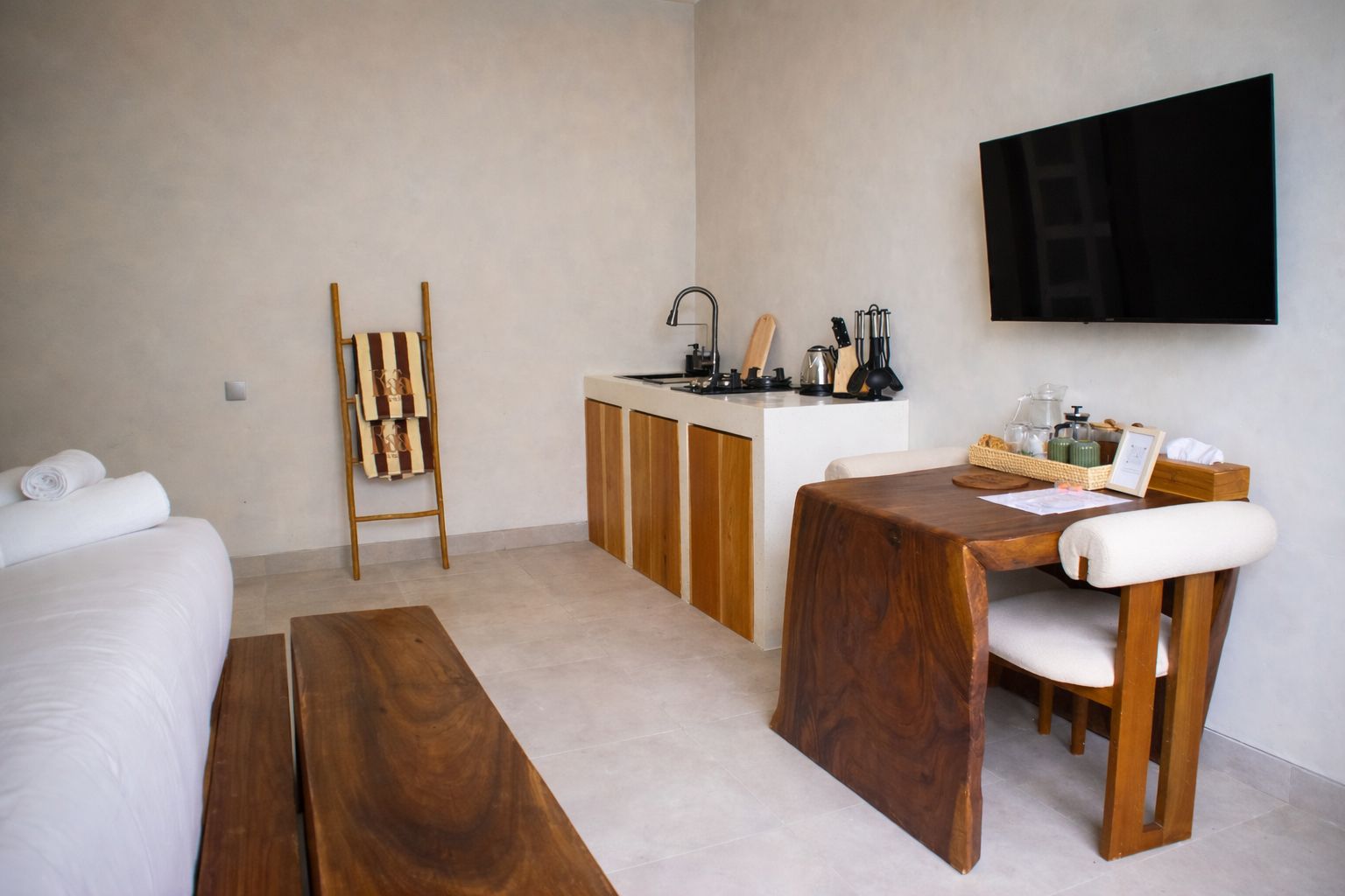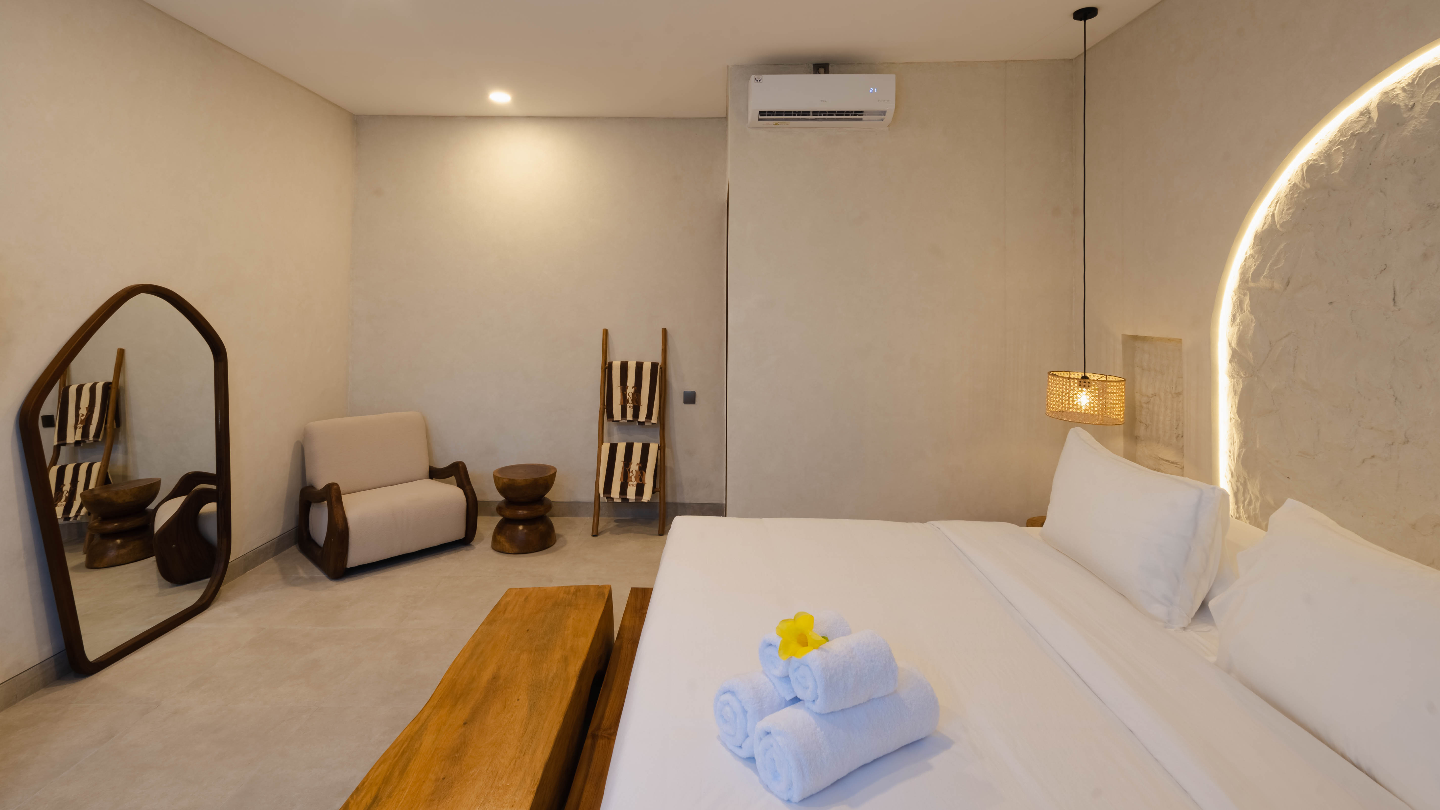 Kala Lombok Hotel offers 14 thoughtfully designed rooms, including Deluxe Natural, Deluxe Terra, and Deluxe Suites. Each room features a modern, elegant style and a comfortable, relaxing atmosphere, with private bathrooms, air conditioning, Smart TVs, terraces, and essential amenities, ensuring a pleasant stay for leisure or business travelers in Kuta Lombok.